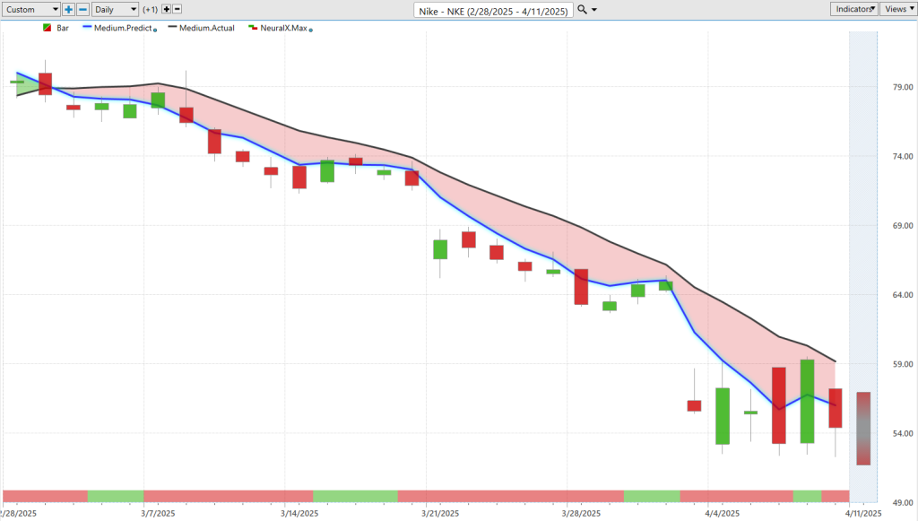 Now, **Nike ($NKE)** is another compelling case. Similar to the broader market and indices, it’s been weak—making it a good candidate for hedging or shorting. As expected, the news impacted it significantly, and traders who acted early benefited. The stock is down 29% over the past 27 trading days, and just from recent predicted highs, about 15–16% in just eight days.