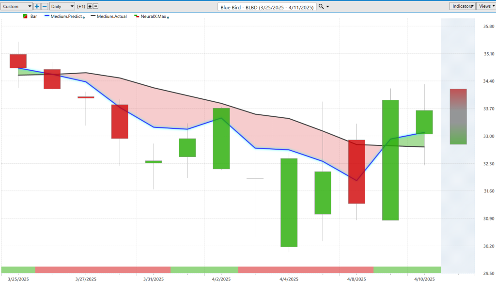 Now to **Blue Bird ($BLBD)**. It’s interesting because it’s been on my radar. Recently, the blue line crossed below the black line, and the neural index turned bearish. There’s been a lot of noise in this forecast, but some conditions are starting to reverse. So while many stocks like **Las Vegas Sands** and **Xerox** are still in downtrends, some stocks like **Blue Bird** are starting to pivot.