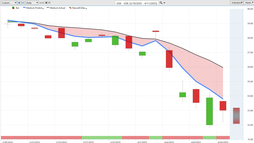 **GSK**, a large pharmaceutical, continues in a strong downtrend despite choppy behavior. You constantly see gap-ups to previous predicted highs followed by sharp drops. This provides profitable shorting opportunities. The trend remains bearish, and the blue line stays below the black line.