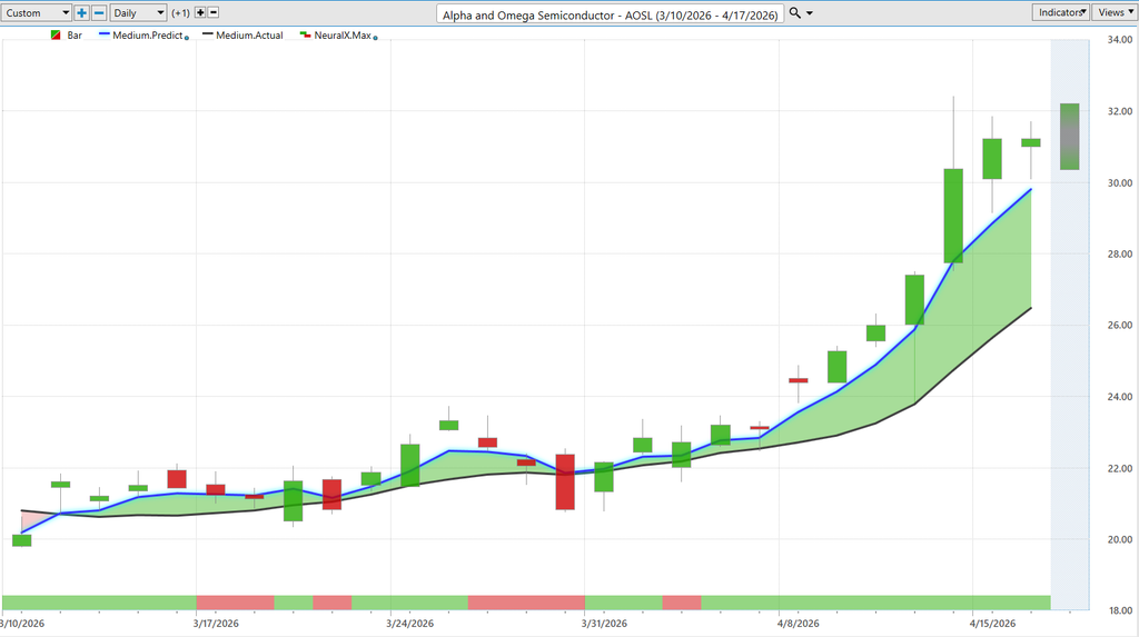 Now, of course, we’re likely to see tech stocks move higher. Well, here’s shares of Alpha and Omega Semiconductors. This is a good example of how all of these predictive indicators work together. Now, you’ll notice that our neural index is bearish here. And what happens? Sideways price action, a gap down. But you’ll notice that this blue line, that predicted moving average that we covered, has never crossed below the actual moving average. So it’s telling us this, the overall trend is still bullish here.