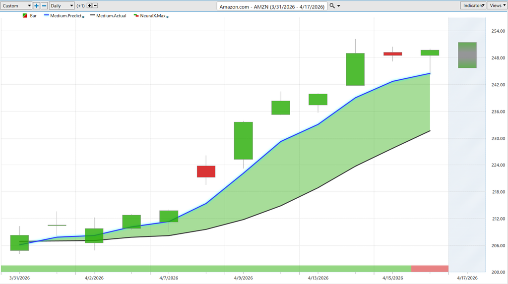 Here’s shares of Amazon. And this is going to trade much more in line with the index. But a very nice setup here with that blue line crossing above the black line. And VantagePoint really makes it easy to do your analysis. So when you say, “Hey, look, we’ve got an opportunity in Amazon here. Maybe we should look to go ahead and long.” Well, where should we look for those price levels? Of course, VantagePoint, if you have an order waiting down at that predicted low, you’re just going to get filled at the open and the market’s going to move higher.