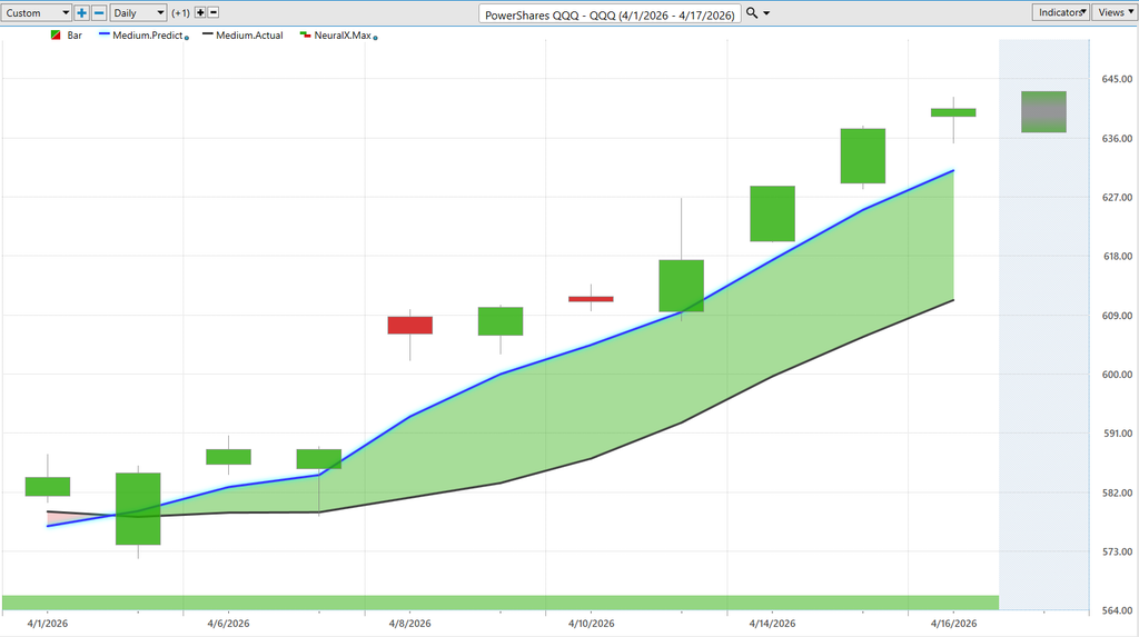 So, if you haven’t already, be sure to go ahead and click the link down in the description below. Get signed up for a live demonstration and you can learn all the specifics about how these predictive indicators and artificial intelligence technologies are helping traders make much better trading decisions out in the marketplace. Uh, and so we’ll revisit the broader stock market here. So, the past couple of weeks, we’ve gone ahead and looked at SPY. Well, we have a very similar forecast in shares of the Q’s, QQQ.