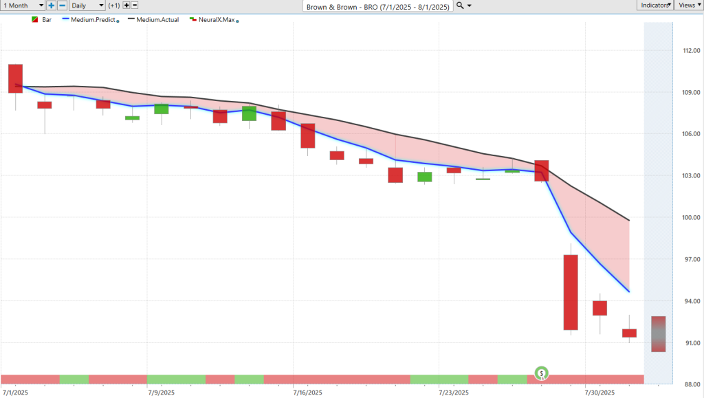 Um, here’s Brown & Brown Insurance, a very straightforward example of markets in a downtrend. Uh, here you have the blue line crossing below the black line. Neural index bearish going into this move. And you’ll notice these little blips where the neural index gets bullish. Notice how the market just runs sideways for really several days here—four, five days—where the market just keeps running sideways. But the overall trend here is down. So all you’d want to do is short, take profits on shorts.