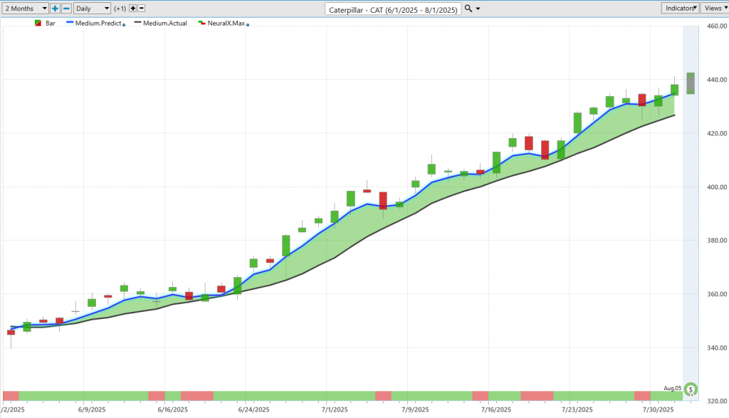 Um, now Caterpillar was a name we looked at last week, highlighting all of this strength. So again, we’ve got a lot of earnings coming up on the calendar here, but you’ll notice that within this uptrend, we take the exact same approach—blue line over black line. You’ll have these periods of consolidation, but as long as that predicted moving average—you see all through this period, lot of separation from the actual moving average.