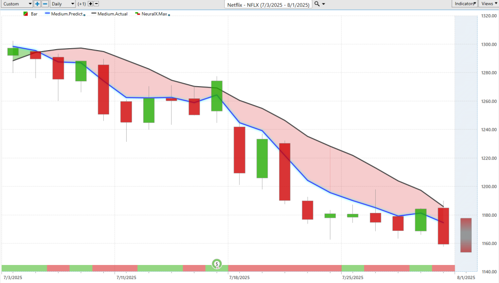 Let’s take a look at Netflix, which, uh, at a certain point this year was one of these unstoppable stocks—just kept moving higher and higher. Well, what have we seen here for the last month of trading? Well, here we see, obviously at the beginning of July, blue line crossing below the black line, neural index bearish here. You have this little choppy period where we just sort of, uh, uh, you know, drift around going into earnings, but the overall trend here—very bearish.