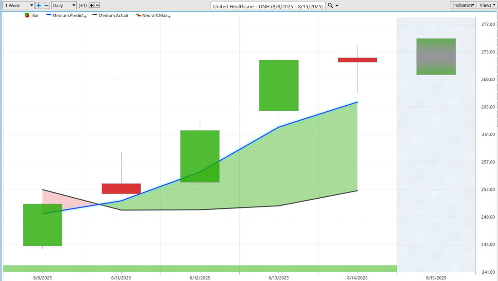 And so you see we’re moving down to these predicted lows once again, and just a lot of momentum to the bullish side here with the neural index very, very bullish. This is a market that’s certainly been on the radar for a while, understanding that this health insurer is in an uptrend.