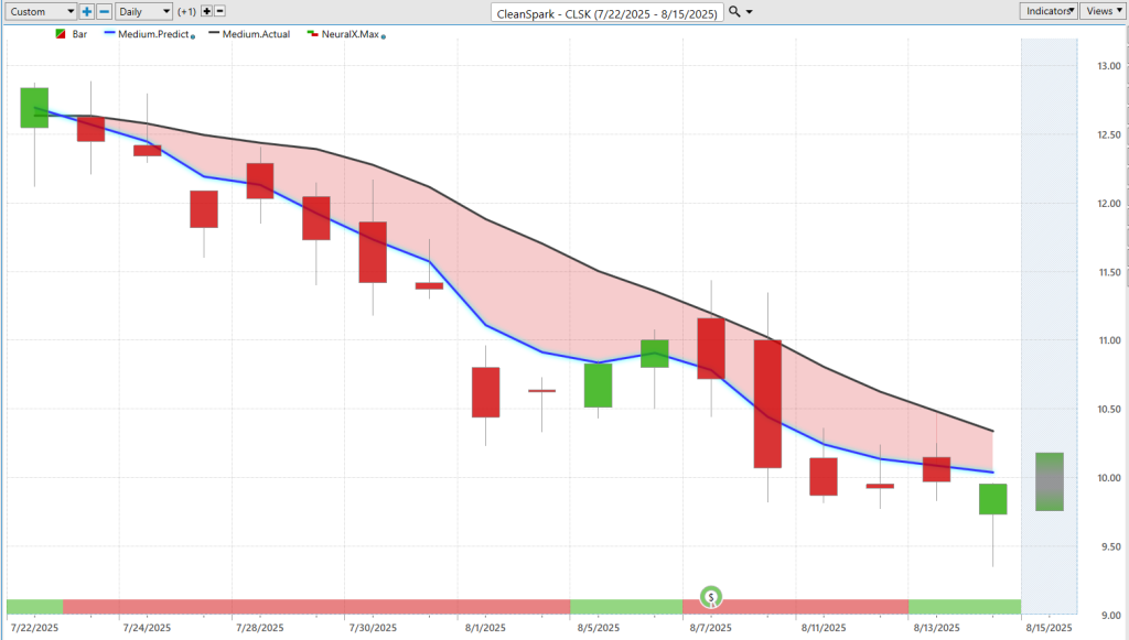 So, exciting stuff there. But here’s a different situation — this is Cleanspark ($CLSK), one of the Bitcoin miners. Here’s Cleanspark. Prices even hit an all-time high this week. However, in this Bitcoin mining stock, we see that blue line crossing below the black line. If you’re doing some trading, this is really not the place where you want to be doing especially some short-term trading on the bullish side.