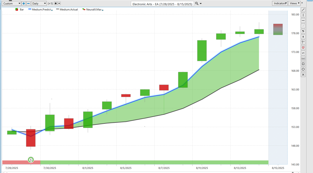 Lastly here, here’s Electronic Arts ($EA) — as plain as it gets. Blue line over black line. We actually went through earnings here. So, if you do any trading after earnings, you’re saying, “Okay, now we have a bullish trend here. The neural index is bullish every single day.” Some persistence as far as momentum goes.