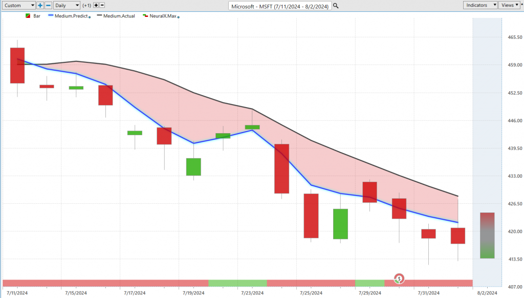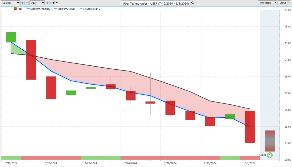 Lastly, we’ll end on Uber ($UBER). Just another example of how all these predictive tools work, but a nice example here of how you go into a downtrend, this neural index gets bullish and again lets you know of some subsequent strength over the market. Notice how this blue line gets even further away from the black line indicating that strengthening of the downtrend. Of course, we can bring up these very short-term levels in tray, and you see again predicted high and moves lower, predicted high moves lower. We move up to this previous predicted high, goes lower, goes lower, goes lower. Now we’re getting earnings coming in about next week. Really exciting opportunities, especially if you’re willing to hedge their portfolio, maybe buy some put options, get on the bearish side of things. Even if you just wanted to be on the bullish side, recognizing those areas where you can at least get a good entry, trail your stops, as we see volatility really entering into the marketplace. A really nice example of why it’s critically important to have these tools so you can identify where the strongest and potentially weakest opportunities are throughout the marketplace. Again, I encourage you to go back and watch many of those previous Hot Stocks Outlooks from the past several weeks, and you’ll notice a particular pattern here and a theme of highlighting where those strong markets are from the forecast but understanding that there is some broad weakness here that we’ve seen in Microsoft and certainly the broader SPY and Qs. I’ll go ahead and leave it there. Once again, this has been our Hot Stocks Outlook for August 2, 2024. Thank you all for watching, best of luck, and bye for now.