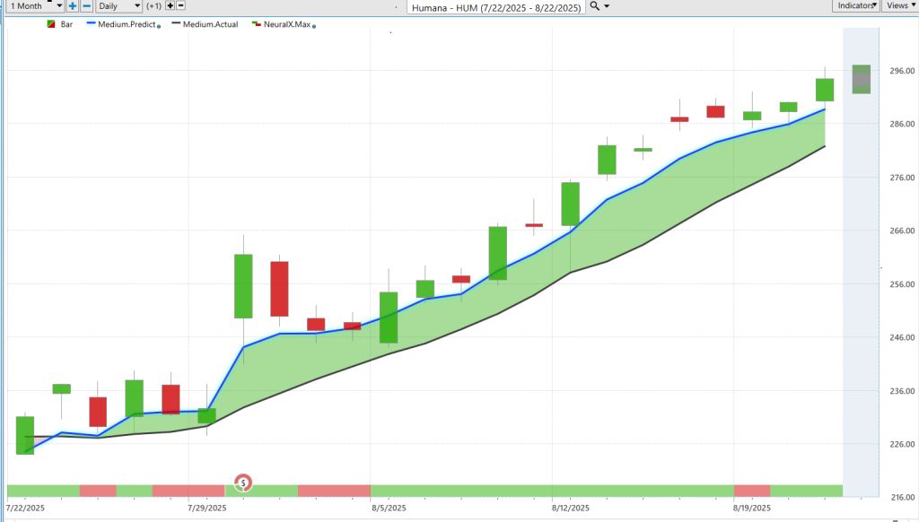 A little dip from the neural index, then that momentum kicks in, and really things pick up in the marketplace. And so, we can take a look at, well, in the short term, how have these predicted highs and lows performed since last hot stocks outlook? Well, you see here we’re getting a gap up, uh, last Friday. Uh, here’s Tuesday, here’s Wednesday. Uh, and the trend persisting to the upside. So, pretty exciting stuff there in shares of Humana. And again, just highlighting managing an opportunity, right? If you want to potentially add to a position or just do a short-term day trade, these tools are very exceptional at getting you those nice entry prices, uh, and not having to risk a huge amount to participate in an opportunity.
