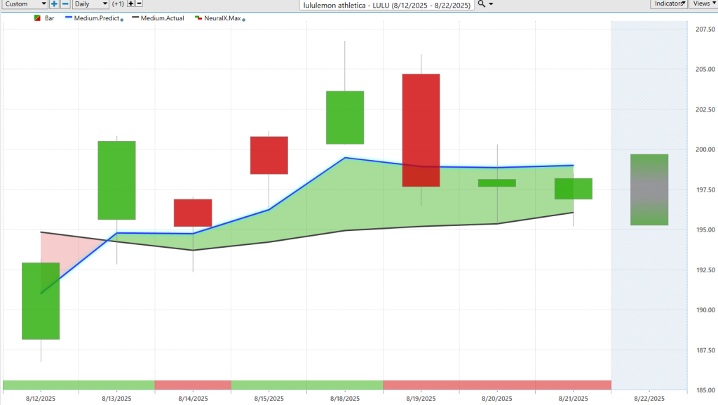 Uh, and lastly we can take a look at Lululemon. So, this is again more recent opportunity but seeing these fresh crossovers to the bullish side. Uh, you see the neural index has been bearish last couple of days, just running sideways, but a lot of distance between that predicted moving average and the actual moving average.