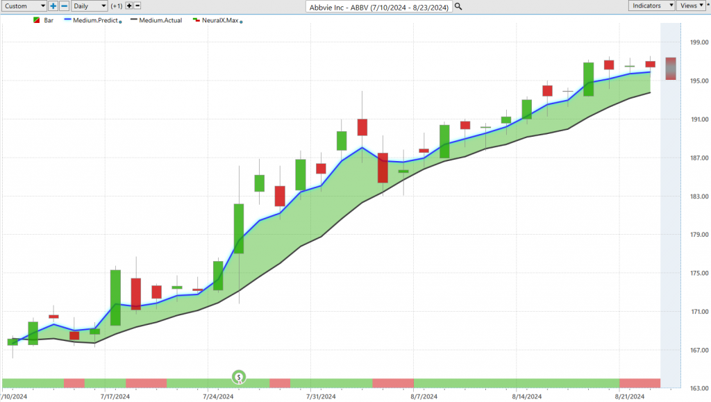For this value to get calculated and plotted on the chart, the technology of artificial neural networks is coming into play. They’re performing what we call intermarket analysis. This means we’re able to understand markets that are known to drive and influence the future price of whatever the target market is that you’re trading. In this case, for AbbVie ($ABBV), that could be things like the bigger ETFs like SPY, potentially the Invesco QQQ Trust ($QQQ), or some biotech ETFs. It can also look at subtle relationships between individual stocks. Traders can’t always understand the importance of these relationships, but it even looks further at things like the value of the Dollar Index, interest rates, and global commodities that may affect the target market you’re trading. If you’re trading gold mining stocks or copper mining stocks, these all have a very important effect.