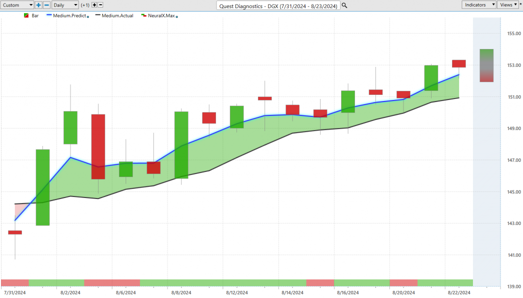 Next, let’s look at Quest Diagnostics ($DGX). A very similar situation: we get the blue line crossing above the black line, neural index bullish going into this move. But notice, when the neural index turns bearish, you get those subsequent 48 hours of weakness, with the market trading down towards the Vantage Point predicted lows. However, that blue line remains solidly above the black line, indicating the overall trend is up. A 5% move in shares of Quest Diagnostics ($DGX).