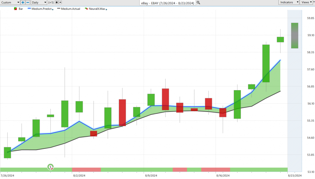 We can look at all those predicted high and low ranges. You see some noise coming through—these are actually our earnings markers to let us know earnings are coming up. You get all that volatility, which is typical around earnings, but notice how quickly the software gets back on track, saying, “Be prepared for these predicted highs and lows to swing around. If you want to be a buyer, get those entries down at those predicted lows,” and the market starts to trend higher. A nice move here recently in shares of eBay ($EBAY), overall, about an 8% move in the past 19 trading days.