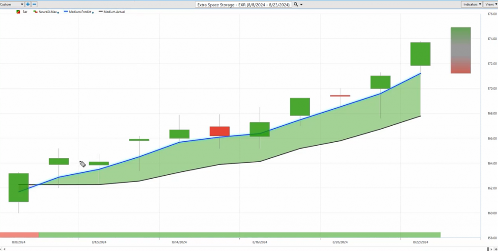 Here’s Extra Space Storage ($EXR). A very straightforward forecast. It highlights what we want to identify here: seeing that trend to the bullish side and seeing that neural index skewing to the bullish side, indicating that we should expect some subsequent strength over the next 48 hours. You notice how the market keeps climbing higher and higher each day. A very bullish forecast. If we want to bring this down to the short term, traders are looking for opportunities to take positions intraday. We see really nice opportunities here as the market starts to move higher.