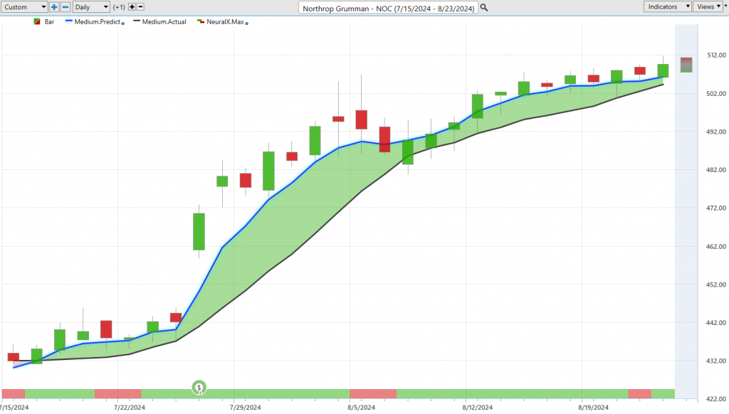 In the past couple of weeks, we’ve seen great examples of this: moving to predicted lows and hitting predicted highs, offering those particular levels to minimize risk in the overall trade but getting exposure to these trending markets. We’ve seen about a 17% rally just in the past 27 trading days in Northrop Grumman ($NOC), offering nice opportunities for traders, whether you’re a long-term swing trader or shorter-term day trader.