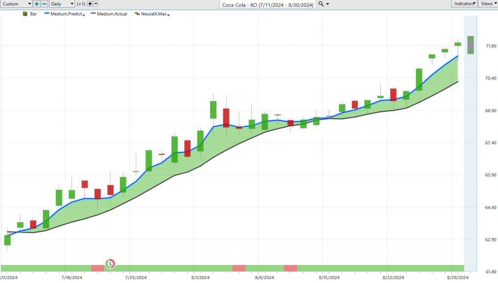 And so that’s why what we want to do is compare that value to the VantagePoint predicted moving average. And for this number, essentially, a price of future prices moving forward for that to get calculated and plotted on the chart—well, this is where the technology of artificial neural networks comes into play and is performing what we would call intermarket analysis. And so what A.I. is very good at doing is taking in a huge amount of data and then summarizing that into an output with a very highly accurate prediction. And so what the inputs are that are going into our analysis of Coca-Cola are specific to that stock. It can be things like the broader indices like the SPY or the NASDAQ, but it can also be important ETF groups and individual stocks that are found to share important market correlations. And this can be leading and lagging relationships, inverse and positive correlations, and so it’s very important to do this analysis really on the whole and get a good forecast and output moving forward. But, you know, this goes all the way down the line even to things like global interest rates, the value of global currencies, the dollar plays a big impact on where stocks are moving generally higher or lower, and also global commodities like gold, oil, copper, and soybeans, whether, again, they be relevant to that target market in producing these accurate forecasts.