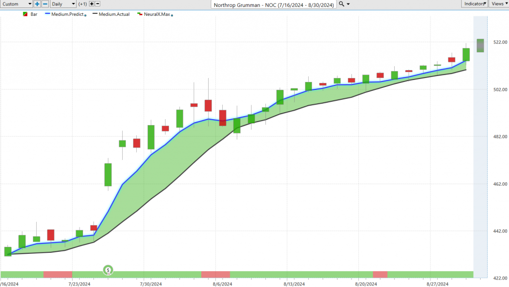 And so here in Northrop Grumman, we really highlighted, yeah, we’ve got this crossover to the bullish side, ample opportunity to go ahead and get involved. But more recently, as the market drifts and slants higher, well, how are those predicted highs and low levels working? So we see even if we just want to look at the last week, here’s Friday, here would have been Tuesday, and benefiting as the market starts to continue really its trend here. But look at these numerous predicted lows being hit, and even the predicted highs, right, moving up towards the predicted high. So, depending on your trading style and approach, well, you understand, look, short term, maybe you want to take profits, reset the position, and really make the most of many of these opportunities as we see where the bullish trends are. Well, you know, that’s where you might want to do some of that shorter-term trading. So, about a 20% rally just over the past 32 trading days. We really highlighted a lot of these defense stocks doing quite well, as we see international relations and things starting to heat up a little bit all over the world.