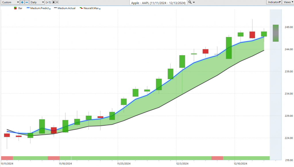 And we can see actually here on Monday that’s about as good as it gets for a trader trading Apple here, right? We moved down towards that predicted low; we can take an exact look at this, a predicted low of 241.83, the actual low of 241.75, uh, you have a limit order, you get filled, and you’re going to benefit as Apple shares advanced this week over the last four trading days, going into Friday, up 2 and a half percent.