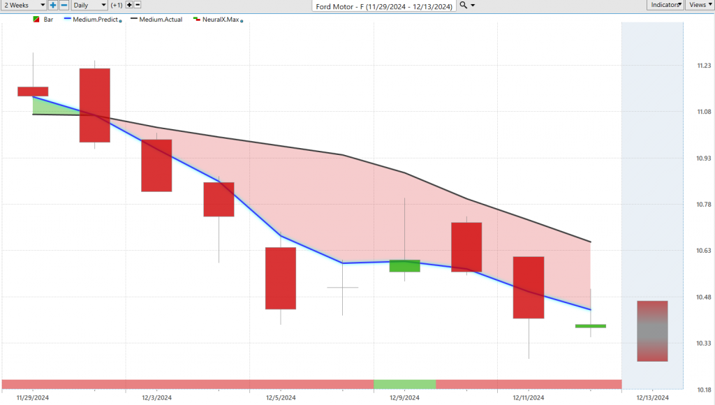 Ford Motor ($F), so whether you want to hedge the portfolio or just identify markets where you want to avoid that aren’t good markets to trade, uh, here shares of Ford Motor Company, and you see here again, blue line crossing below the black line, a lot of weakness from the neural index, and look at this separation between that prediction of the actual moving average, the prediction of the predicted moving average, and the actual moving average, signifying that this is a strong trend. And so, so what I get a little worried about is if we saw some of that weakness in some of the other indices coming through and everything starts to want to go lower, uh, some stocks may be really poised to, uh, take it on the chin here.