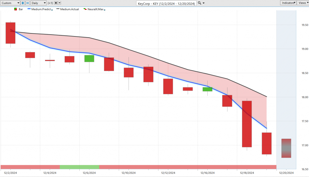 So, again, just over the really, just you know, past few trading days, you can see this guidance you get from these predicted highs, saying, try to short up near these levels if you want to add to that position, but numerous entries just like with, you know, the Russell and some of these other indices of seeing this weakness come in and identifying where to get those short positions on. So, really nice opportunity here in shares of KeyCorp, seeing the market scoot a little bit lower here. And overall, this becoming an 11% decline here in just the past 13 trading days.
