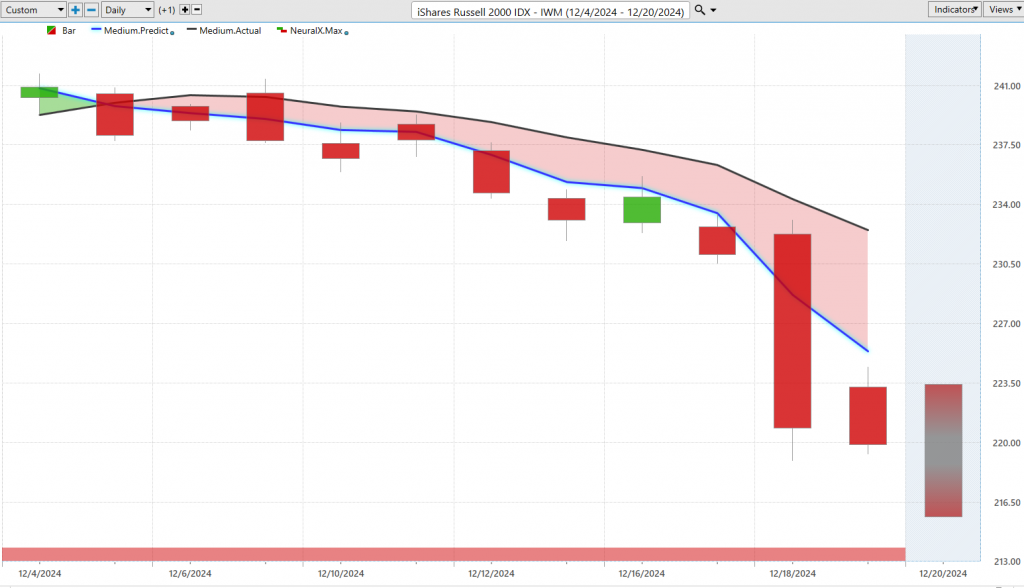 And so specifically to the Russell, it understands which markets to really pull these price clues from, and then generate highly accurate predictive indicators. And that’s what we look at each outlook here in our hot stocks Outlook. And so as long as that blue line remains below the black line, the overall trend is expected to go lower. And so we can see if we go back, you know, 5 days ago, to what these forecasts look like. Well, why are we anticipating weakness in the broader marketplace? Well, because the Russell and the Dow are in very strong downtrends, both the trend and the very short-term predictive neural index, which we’ll go ahead and take a look at here shortly.
