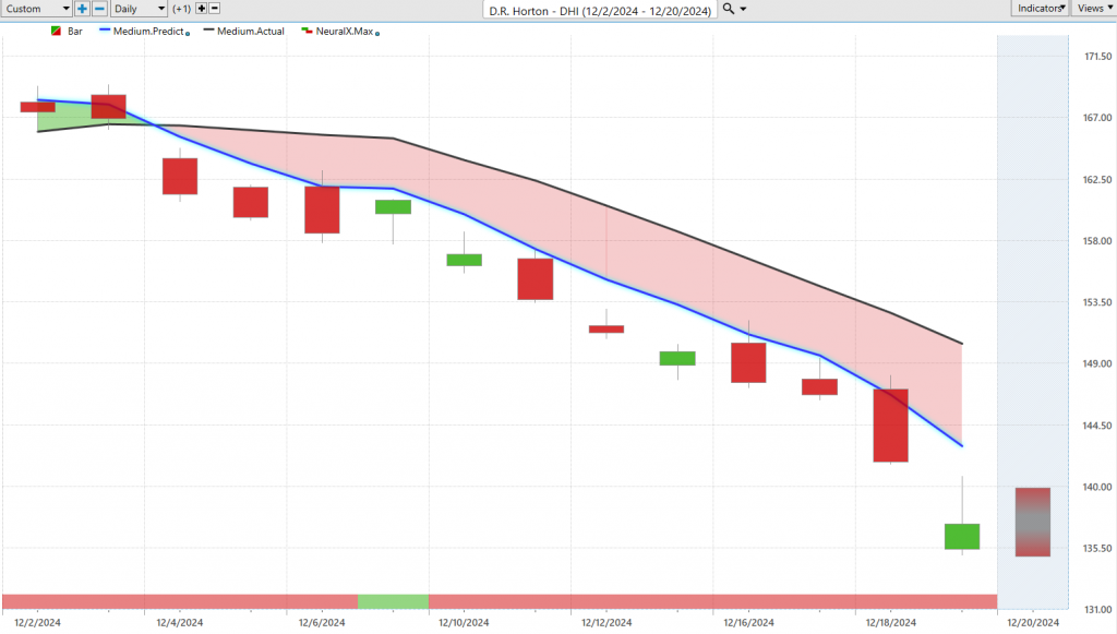 Here’s D.R. Horton, so home builders are all not looking well. Blue Line crossing below the black line, neural index very bearish. Uh, we had one day where it clicked up bullish and then immediately back down to bearish mode, and uh, declining further. So, we can again look at this last week of predicted highs and lows and excellent entries to establish a short position, and yesterday starting to gap down and and really aggressively go lower. So again, just to offer that forewarning that okay well, we’re starting to see this weakness, where if we want to take bearish positions in the market, does that make sense? And the forecast do a good job of really pointing you to where is that weakness really playing out here.