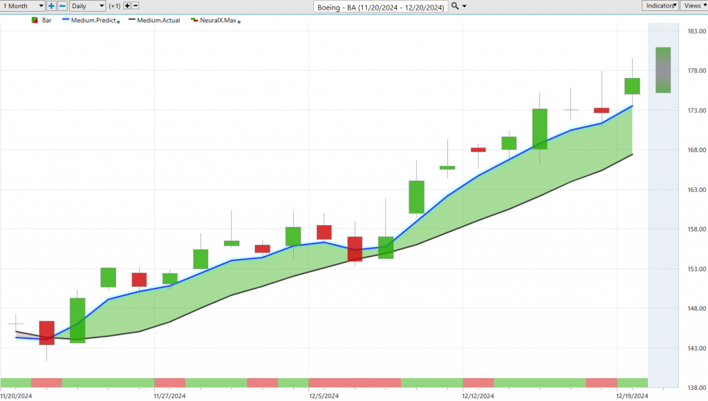 Uh, one of the few markets that’s actually been Boeing and a good example of how all of these predictive indicators work regardless of the type of TR trading that you’re doing. So you know, looking for short positions well Boeing was a great opportunity to get on the short side, you know, in the previous months but now we see this Blue Line crossing above the black line, neural index bullish but a little bit more variation here with our neural index as we see here markets running sideways for a good bit of time before that momentum kicks back into things uh but one of the you know rare markets with the short-term price action that we’ve seen where the trend is actually up and the market is trending higher even as broadly shares go lower. So 21% advance in just the past 19 trading days.