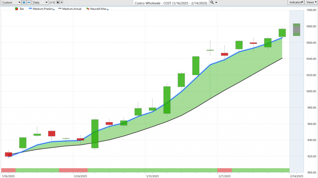 And so, Vantage Point users are able to compare that value to this proprietary predicted moving average, and for this number, which essentially you can think of as prices plotted forward on the chart, well, to plot that number, this is where the technology of artificial neural networks come into play, and they’re performing what we would call intermarket analysis. So, what that means is to forecast the future prices of Costco shares, Vantage Point is able to look at other markets that are known to drive and influence those future prices. So that could be things like other individual stocks, broad ETF groups that wrap up a huge sector or area of the marketplace, but it can also be things like the value of global currencies like the dollar index, interest rates, as well as things like gold or oil or other commodity markets that are applicable again to that target market that you’re trading.