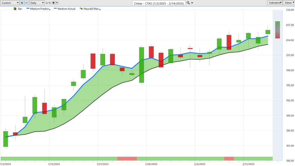 Shares of Cintas, so again, this blue line crossing above the black line, and you’ll get these periods where the neural index goes bearish, and you see how you get these subsequent little gap down periods. So you should expect that reduction in, you know, where the market’s likely to trade. It’s very likely to move below your predicted moving average, but overall the trend is very bullish. You see a lot of distance between that predicted moving average and the actual moving average. Again, getting a little blip here that immediately gets bullish again, and now we can look towards those predicted highs and lows. Over the course of this trade, you see numerous opportunities to get involved early, but even more recently over the past week, you see excellent levels being provided that say, “Hey, if you want to do some trading, try to buy the market down here, take some profit up at these predicted highs,” and manage the opportunity in accordance with the Vantage Point forecast.