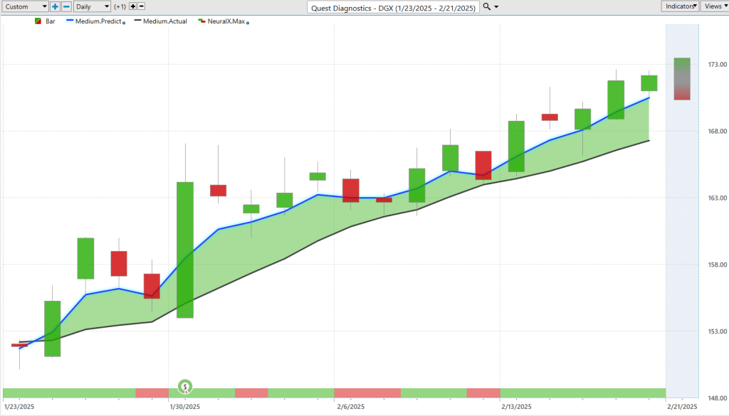 Next, let’s look at Quest Diagnostics ($DGX). This is another great example of how all of these predictive tools work together. The blue line crossed above the black line, the neural index remained mostly bullish, and despite some short-term fluctuations around earnings, the overall trend remained to the upside. Over the past 19 trading days, shares are up 12%, and again, the predicted highs and lows have provided excellent guidance for entry and profit-taking.