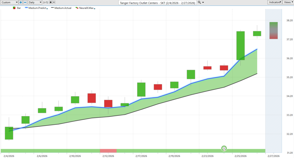 So, here we have Tanganger Factory Outlets. Again, another example of blue line over the black line. Neural index very bullish until we get here, but it very quickly becomes bullish, you know, from that bearish configuration. And we see that momentum picking up in the market going into earnings. Uh, and again, we have these values of the vantage point predicted highs and lows. So, even here, it’s telling you, okay, well, we move down to this predicted low. Expect the low to move a little bit lower tomorrow. Be prepared to go a little bit lower here tomorrow. Uh, but obviously, the overall trend very bullish. You want to keep exploiting the bullish side of the market here in Tanganger. Uh, and it’s been a highly volatile market. You want to be very careful, uh, in identifying where the best opportunities are. Again, about a 15% push in about half the time, about 15 trading days.