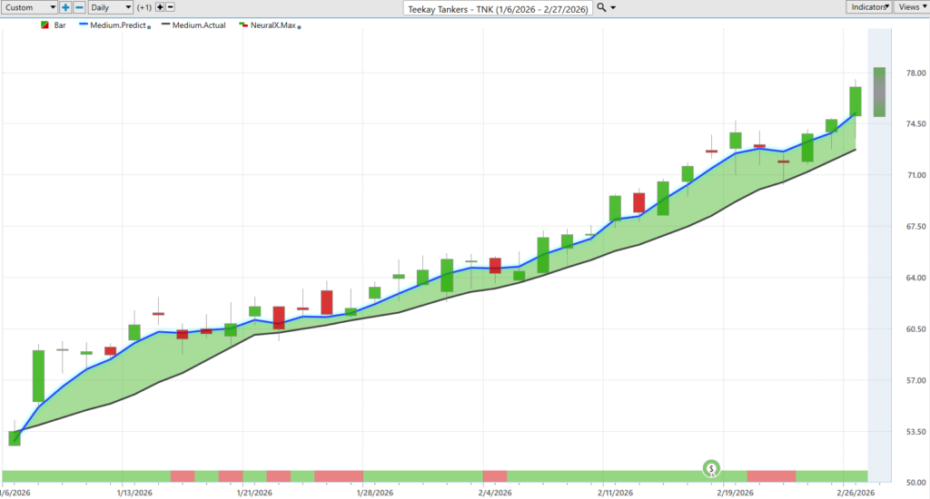 Energies have performed very well. So, actually, last week, I believe, we looked at TK here, uh, and a great example of blue line over the black line. You get these periods where the neural index goes, you know, give you that mixed signal, and you’re seeing the market grind a little bit higher, but some down days, things leveling off, but the overall trend very much bullish, right, that predicted moving average very healthy above the, uh, actual moving average. Uh, and of course, we can just look back at Vantage Point predicted highs and lows. So, even just this last week from looking at TK, here’s Monday’s, uh, uh, predicted range. We move down to the predicted low. You know, you close, you’re in profit by the end of the trading day. Uh, and then you’re seeing about a 9% move, uh, just here over the past, you know, four trading days, just this week from the last forecast here, about seven, uh, and a half percent higher there. So, very exciting move there in shares of TK and really a lot of energy stocks performing well here. So, you see about a 34% move, uh, over these past 33 trading days since this forecast got bullish.