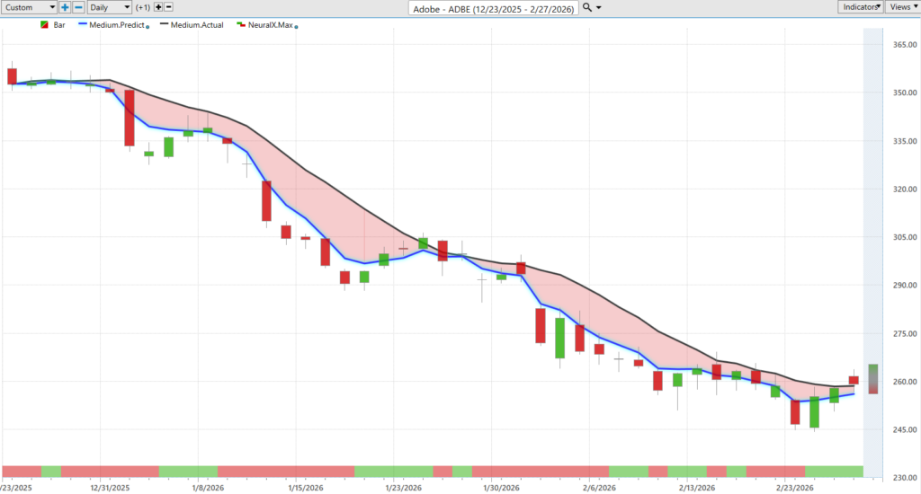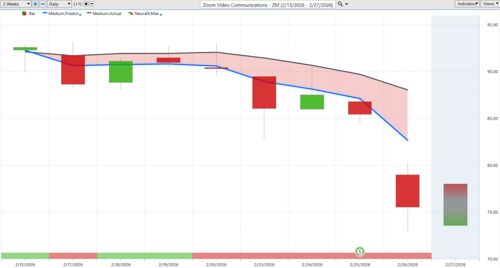Of course, we’ve seen some volatility in the market. So, here’s some of the tech side of things. Here’s Zoom video. Uh, blue line crossing below the black line. Look at the neural index here. Just letting you know, hey, we’re likely to go sideways. Expect those higher highs over the subsequent price action. But, you’re actually getting more separation with that predicted moving average and the actual moving average. Uh, and of course, as we look at those predicted highs and lows, well, these act as excellent levels to short, take profits on short positions, uh, and we see the market really responding poorly there to earnings, but really nice opportunity to really get ahead of the earnings report potentially, uh, and capitalize on a lot of this bearish volatility we’ve been seeing across, uh, technology stocks and the, the NASDAQ. Uh, here shares down about 17% just over the past eight trading days. Uh, and of course, uh, that story about software stocks being weak.