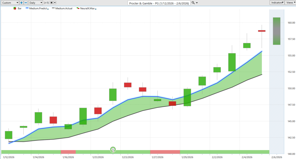 Now, where has there been strength in the market? Well, it’s a lot of the, uh, non-cyclical stocks, a lot of the consumer staples. Here’s shares of Coca-Cola ($KO). You see very clearly that predicted moving average getting solidly above the actual moving average, and over the past couple of weeks here, I mean, this has just been a very strong forecast one day to the next, indicating that, look, you know, there may be some weakness across the major indices and software stocks, but we are in a very strong uptrend, uh, in a lot of these consumer staples.