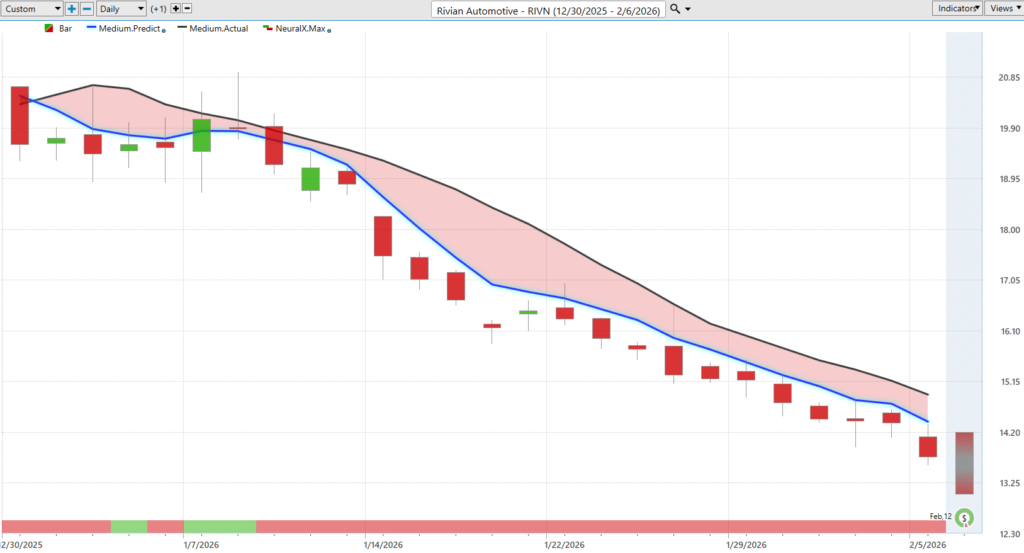 Rivian Automotive ($RIVN). So here’s Rivian Automotive ($RIVN). Uh, blue line below the black line. You see this neuroindex getting bullish, and you get a little sideways price action. But very clearly this market is in a strong downtrend, and traders are going to get that road map every single day that says, look up towards these predicted highs if you want to trade at all, be on the short side.