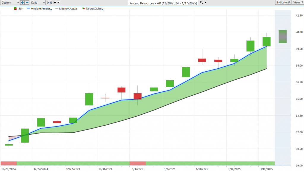 And so, whenever we see this blue line, in this case, cross above the black line, we’d expect those average prices to start moving higher. And this is where, again in energy, we’ve seen a lot of strength coming into play. Now $AR, we looked at last week, but if we go back and just rewind the last five trading days, what I want to highlight is how some of these shorter-term predictive indicators work, right? So if we look at the very bottom of the chart, you’ll see this bar that goes from green to red back to green, and this is called the VantagePoint predicted neural index.