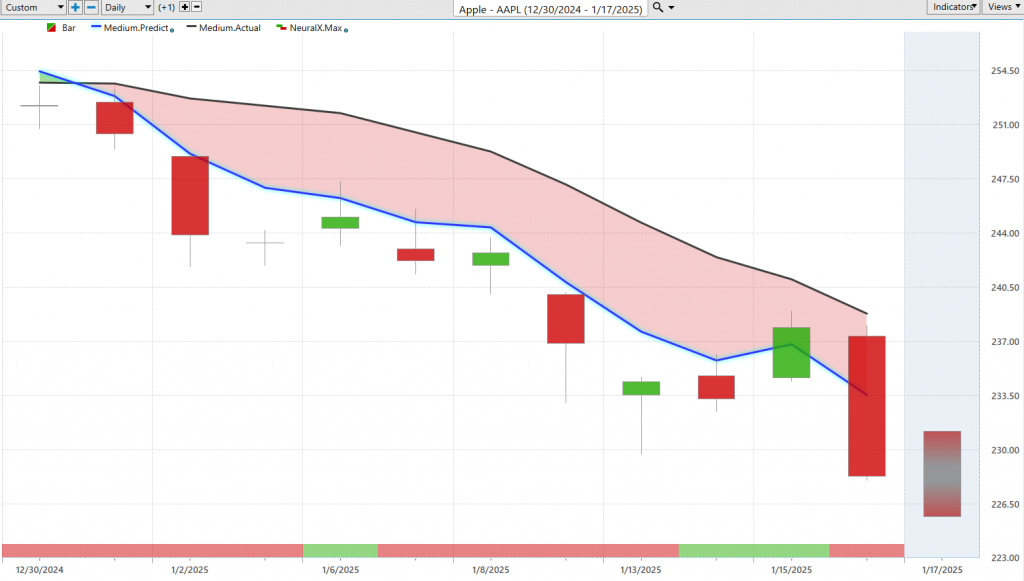 So, this has been an interesting start for Apple. You see here these predicted highs standing out as areas not to go long, but actually to set short positions, and we see the resumption of a lot of that weakness in the market. So again, we can see the overall move here, seeing about an 8% decline just over the past 10 trading days to start the year here in 2025.