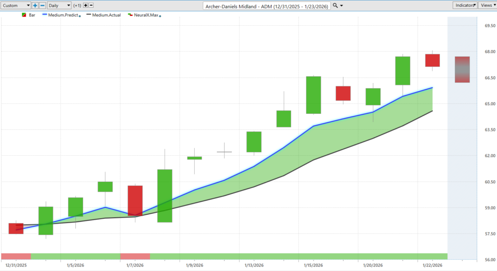 ADM. And what we are looking at here is daily price action. And as always, all of this data works off of end-of-day data. And right up against those candles, what you are going to notice is there is a black line and there is also a blue line value.