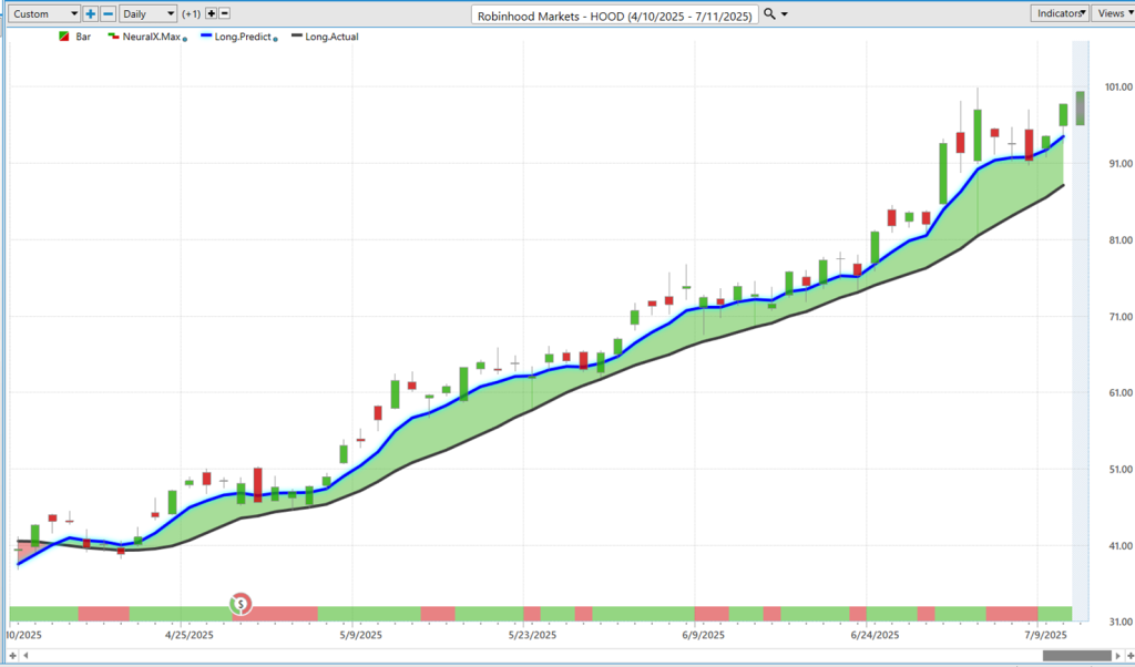 Well, we can see, okay, well, how accurate are those short-term predicted high and low levels? And so, again, we can see here that, well, Robin Hood clearly in an uptrend. Uh, and where do we want to be looking to accumulate a position? Well, again, down at these VantagePoint predicted lows. Uh, and you see here, even from what would have been Tuesday here, moving down to this predicted low going into, you know, really the end of the day Friday here, we’ll get another candle—already up about 8% from those levels just on a weekly basis. So, just over the past three trading days, about an 8% move.