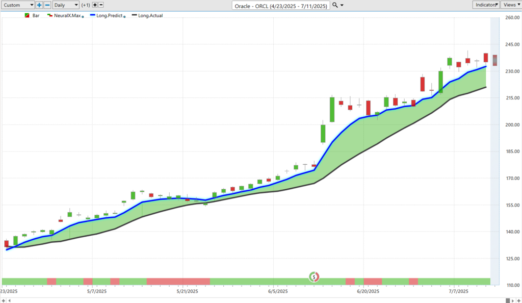 Uh, Oracle, another one of—Oracle ($ORCL)—these, uh, opportunities we looked at in previous weeks. And again, we can say, okay, well, as far as traders making adjustments in the market, where are these predicted highs and lows settling in at? And so, we see moving down to this predicted low, getting a nice uplift. Uh, and even in these, uh, weeks where we really run sideways, you see the software does a good job at saying, “Look, expect prices to remain down at these predicted lows, but still the overall trend is to the upside.” And so, you see you get a little bit of a gappy price action where you eventually scoot up to those predicted lows, settle lower, scoot back up and gap up to those predicted lows, uh, and the market resumes forward. You see that neural index very bullish, anticipating consistent strength over these subsequent 48-hour periods.