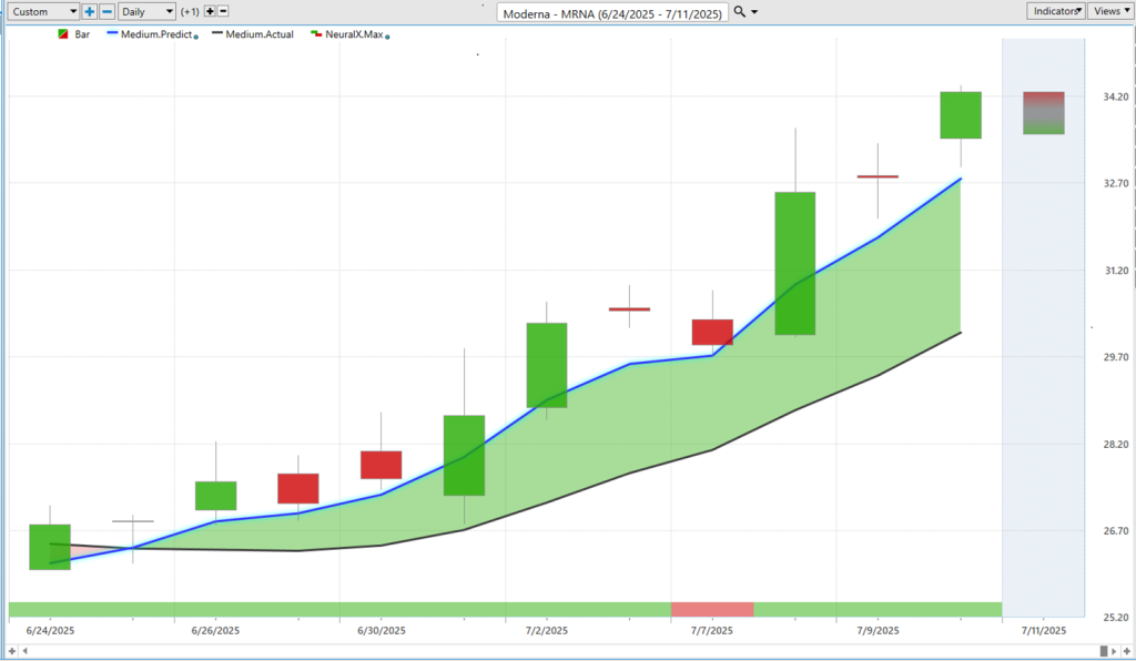 Uh, next here, we have Moderna ($MRNA).—had a really nice week. Uh, and very similar situation where when we really can use some of the scanning features found in VantagePoint here, uh, to identify these fresh crossovers, to identify where those predictive indicators are moving in a bullish way above the actual moving average, signaling that an uptrend is about to get started here.