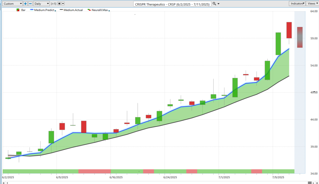 Uh, and lastly here, CRISPR Therapeutics ($CRSP)—another market we’ve looked at, uh, in previous weeks. And again, just highlighting that when you see these markets in uptrend—and especially if you can establish a position with those, you know, valuable predicted lows and get a nice entry into the market—well, then you potentially can get more aggressive and keep adapting with the market as, uh, time moves forward here.