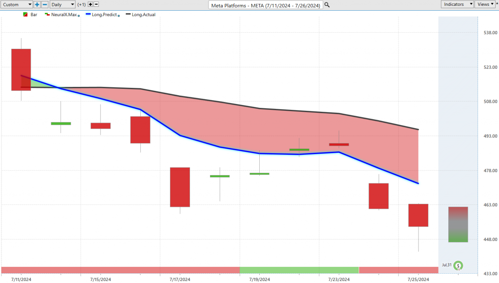 Now, we can again look at those predicted highs and lows, and you see as the market before we really get this decline, we get some levels where we get that neural index or predicted highs being hit before we get that subsequent price weakness, and just really, what I want to highlight here quickly is that even as you get all that noise and volatility coming in, the neural networks are going to keep updating, and you’ll notice that as we get things bouncing around, really get right back on track, neural index doing a good job at identifying levels where traders can short, take profits on those short positions. So, really huge move here in CrowdStrike, we see the entirety of the move here down 33% now in just 11 trading days.