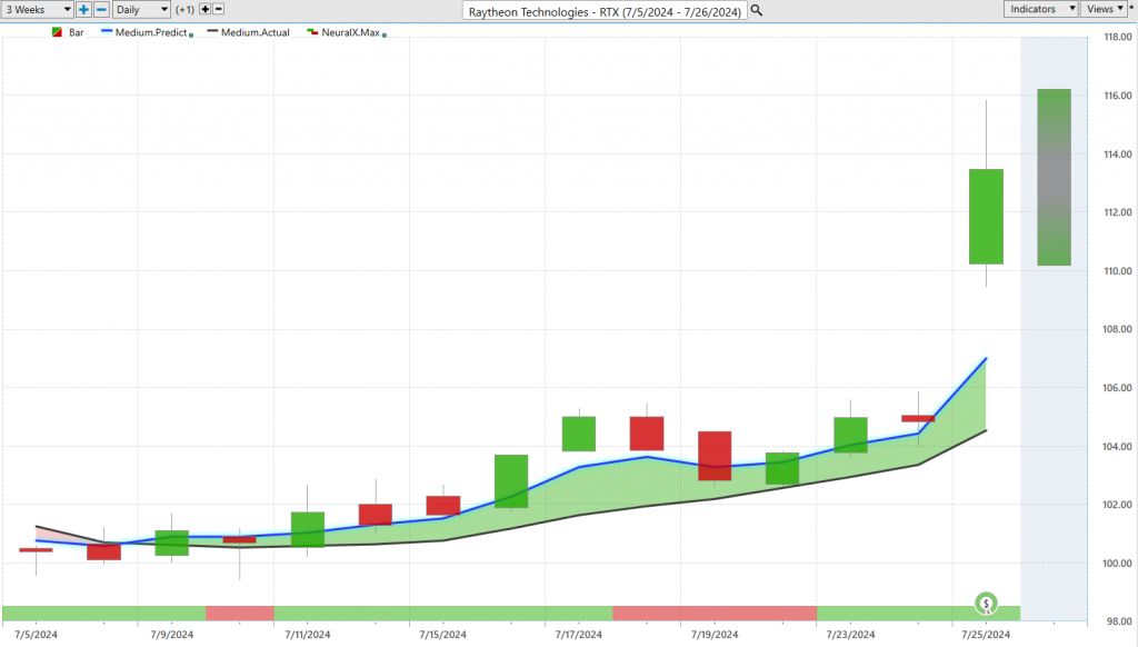 And so, let’s go ahead and move forward here on Raytheon, right, to some of those individual stocks within the space, and again, we can take this same approach, as long as that blue line remains above the black line, neural index bullish, and then you can use those predicted high and low ranges to manage the trading opportunity, understanding that, okay, well, we want to be buyers in this market, looking for price to move a little bit lower in tray, and you see that as we get this earnings push, a lot of strength just generally throughout the sector here.