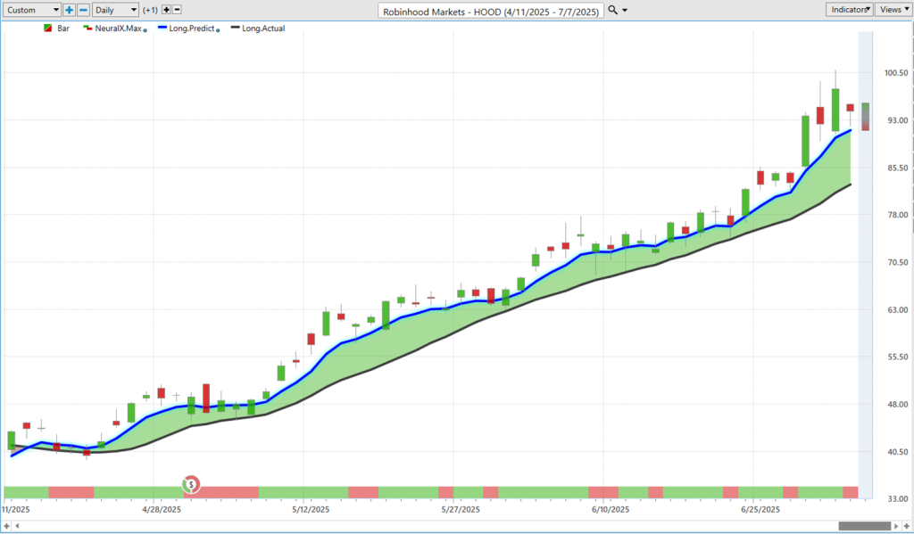 Uh, and even midweek here, right? Scooting down to about 91 here, which would have been Tuesday, uh, and then trading higher through the week and even here on, uh, Thursday, just, uh, sort of closing right at that predicted level. So we’re getting a little bit of a slant lower for the projected predicted high and low—neural index bearish—so potentially some weakness at the early start of next week. Uh, but overall, the trend still very strongly bullish here.