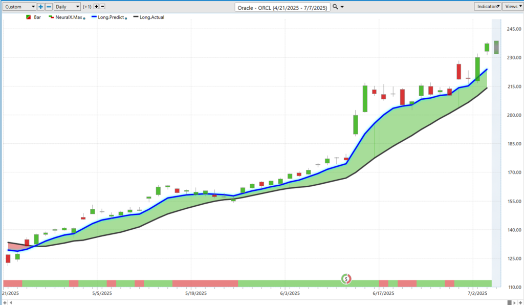 And again, over the past couple of weeks here, uh, we can see how this has performed. So, you know, we get through earnings, get that strong move. And what the neural networks are really good at is adapting—so taking in this information, understanding the price move in the target market, but then looking at those intermarket relationships, whether they be the Q’s, other tech stocks, other AI-driven stocks—um—and then making that assessment of how are these things likely to move in the short term moving forward in accordance, again, with the time frame, uh, of each indicator here.