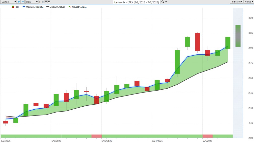 Uh, and so here we see shares of Lantronix ($LTRX). This blue line is above the black line. We’re seeing a lot of momentum come in—predominantly that neural index pretty much bullish, uh, over, you know, it’s probably about 25 candles or so. Uh, and again, we can look at these predicted highs and lows.