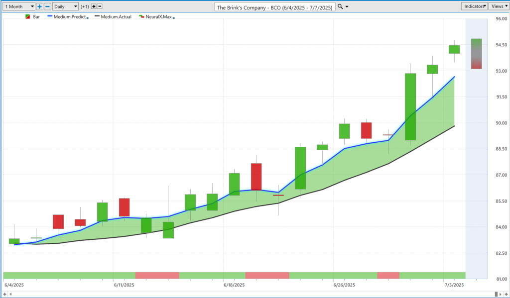 Uh, now we’ll go ahead and start out with shares of The Brinks Company ($BCO), and it’s a really good example of how all of these tools work together to really round out the predictive forecast. And so, uh, as we always do week to week, we’re looking at daily bars and candles, right? So, each one of these candles you see on the chart—that’s going to represent a full and complete trading day.