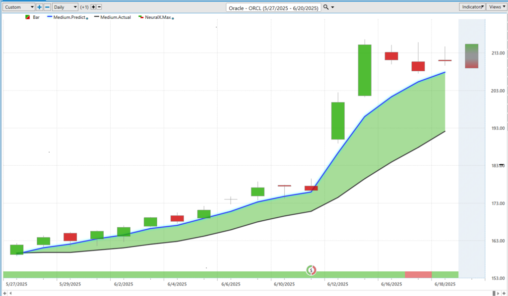 And again, we can look at those predicted highs and lows. And so when traders identify that, “Hey, this is a market of interest, maybe I want to go ahead and take a position here on Oracle,” you see how effective these predicted lows are. So even if you’re a day trader and just want to be involved for really the trading day—or maybe a few hours in the market open in the early morning—you can get that good entry, see how the market progresses forward, and potentially add to that position as the market progresses forward.